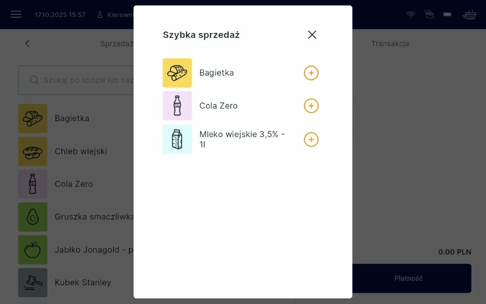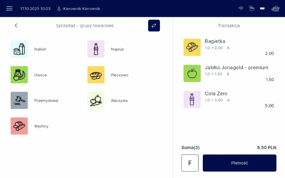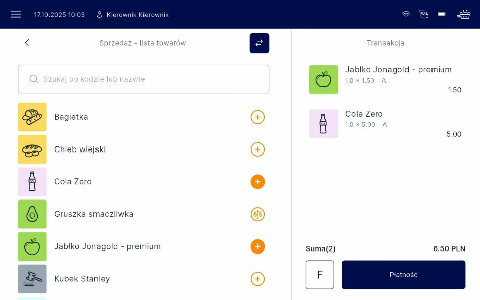 Sprzedaż możesz prowadzić wybierając towary z otwartej listy, grupować je w kategorie, korzystać z podręcznego menu szybkiej sprzedaży itd.